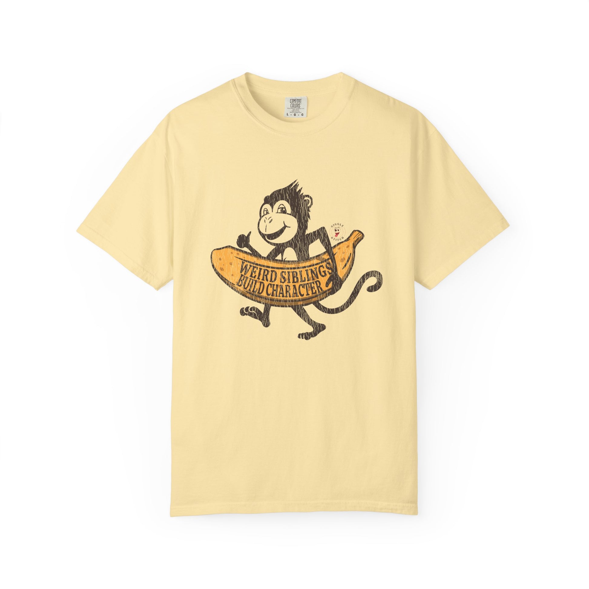 Bold, distressed-style artwork with the monkey grinning triumphantly, banana emblazoned with "Weird Siblings Build Character" in funky, retro lettering. The light-hearted vibe pops against our breezy medium to light color palette—think soft pastels like misty mint, sunny chambray, or whisper white—for an effortless, all-day wear feel.
